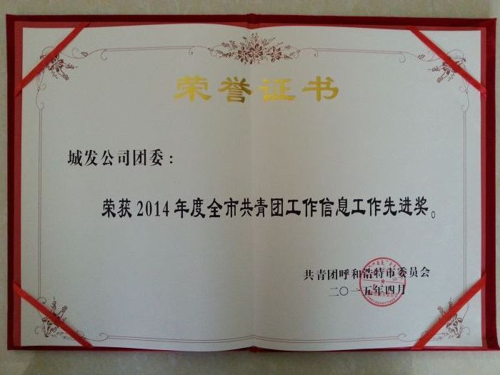 2015年4月3日,在共青團(tuán)呼和浩特市十六屆二次全委(擴(kuò)大)會暨少工委五屆五次全委(擴(kuò)大)會議上,城發(fā)公司團(tuán)委榮獲“2014年度全市共青團(tuán)工作信息工作先進(jìn)獎”。