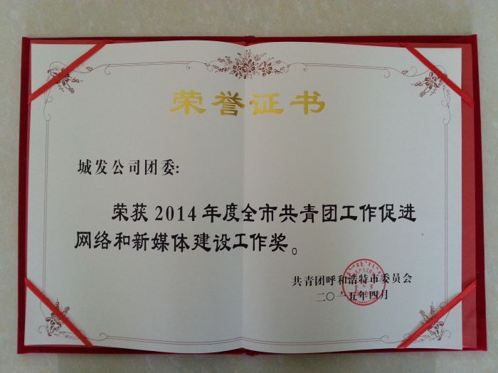 2015年4月3日,在共青團(tuán)呼和浩特市十六屆二次全委(擴(kuò)大)會暨少工委五屆五次全委(擴(kuò)大)會議上,城發(fā)公司團(tuán)委榮獲“2014年度全市共青團(tuán)工作促進(jìn)網(wǎng)絡(luò)和新媒體建設(shè)工作獎”。