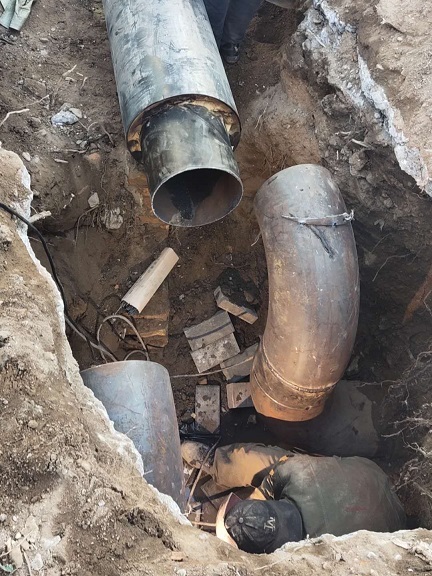 9月27日,展東路與海拉爾大街十字路口的一次網跑水,開挖后發(fā)現相鄰的排污管道有破損,供熱管道浸泡在污水中,腐蝕嚴重,需要先處理好污水管道才能搶修熱力管道,增大了施工難度。經過幾次嘗試,最終決定對漏點處進行線位改遷,重新鋪設管道。經過10天持續(xù)不斷、緊張輪流作業(yè),于10月6日中午,終于修復管網漏點,保證了管網注水試壓。