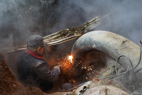 "找到啦!"隨著一聲驚呼,一條約20公分長的裂口,赫然出現(xiàn)在人們面前。雖然當時已經(jīng)是晚上8點多,室外的氣溫也在持續(xù)下降,為了盡快恢復供熱,大家沒有休息,馬不停蹄的開始了緊張的堵漏工作。經(jīng)過一夜的奮戰(zhàn),終于在23日早6點半結束搶修,開始注水。在停暖15個小時后,恢復正常供熱,確保了62萬平米內的熱用戶家中溫度及時上升。