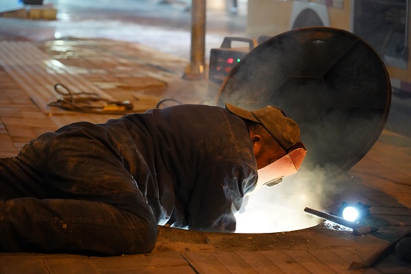 坑里挖的熱火朝天,坑外的工作人員也不停歇的忙著。在距離開挖點2米的一個管道井,一位師傅正趴在井口旁邊,上半身倒栽在進井口,焊接著距離井口半米遠的排氣閥門,筆者站在遠處,都能聞到濃濃的電焊味道,而作業(yè)的師傅也被電焊產(chǎn)生的煙氣嗆得不停的流眼淚,時不時地從井口起身換口氣。