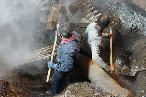 筆者于晚間6:00抵達搶修現(xiàn)場時,大老遠地就看見沿路的井蓋都冒著白色的水蒸氣,進入搶修現(xiàn)場,筆者看到,橋靠分公司總經(jīng)理阮強、副總經(jīng)理張國良、運營四所所長馮俊及公用事業(yè)管理局相關領導在現(xiàn)場緊鑼密鼓地指揮著搶修?,F(xiàn)場兩個搶修師傅正在一個10平方米、2米多深的大坑中,一鍬一鍬地奮力挖著坑內的土,現(xiàn)場工作人員介紹到,因為已經(jīng)接近管道,為確保管道的安全,目前只能人工挖掘。當時的室外溫度在-11℃,工人們卻是滿頭大汗。