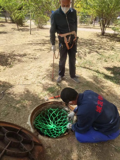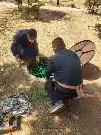 安裝現(xiàn)場(chǎng),工作人員打開(kāi)井蓋通風(fēng),在用氣體檢測(cè)儀檢測(cè)井內(nèi)的氣體符合作業(yè)條件后,工作人員綁好安全帶用電鉆在井壁上鉆孔,釘入尾端帶鉤的膨脹螺栓,擰緊固定后將防墜網(wǎng)掛到掛鉤上,一張防墜網(wǎng)就安裝完成?,F(xiàn)場(chǎng)工程師傅每完成一個(gè)防墜網(wǎng)的安裝,在確保安全的情況下,都會(huì)親身踩試檢驗(yàn),確保安裝牢固。