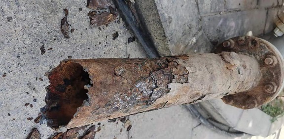 筆者用腳稍微用力踩了一下從地溝拆除出的腐蝕嚴(yán)重管道,一片片鐵銹渣渣就掉了下來。