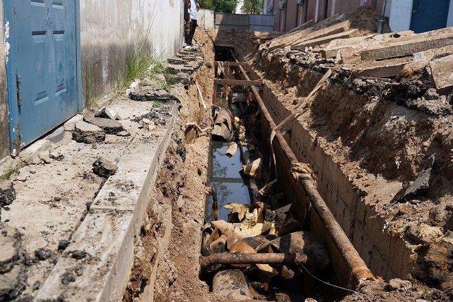 開(kāi)天花園小區(qū)施工直播結(jié)束后,我們直播組直奔如意小區(qū)供熱二次管網(wǎng)改造的施工現(xiàn)場(chǎng)。循著一陣陣的臭味,我們來(lái)到了如意小區(qū)的A區(qū)一幼兒園后面,映入眼簾的是正在抽排污水的地溝,地溝中的供熱管線距污水水面非常近,污水在炎熱天氣的發(fā)酵下,臭氣熏天。工人們正在深溝里進(jìn)行排污及淤泥清理工作,每一個(gè)動(dòng)作都顯得格外艱難,衣服幾乎和污水一個(gè)顏色。