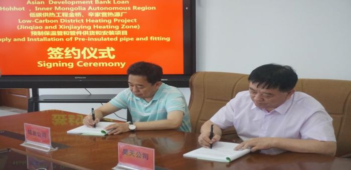 7月7日上午,內(nèi)蒙古呼和浩特市低碳供熱亞行貸款項目呼和浩特市城發(fā)投資有限責任公司金橋、辛家營區(qū)域集中供熱工程第7包(金橋熱源廠預制保溫管和管件3)、第9包(辛家營熱源廠預制保溫管和管件2)采購合同簽約。